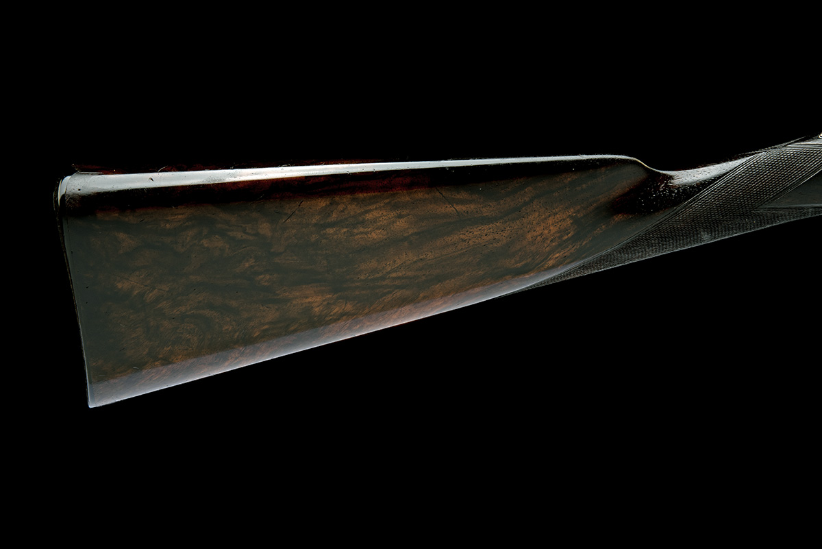 for 1906, 30in. nitro reproved barrels, rib engraved 'WILLIAM POWELL & SON. 35. CARR'S LANE. BIRMINGHAM' and gold-inlaid '2' at the breech end, 2 1/2in. chambers, bored approx. true cyl. and 1/2 choke, treble-grip action, toplever gold-inlaid '2', automatic safety with gold-inlaid 'SAFE' detail, fine acanthus scroll engraving with floral bouquets, retaining slight traces of colour-hardening and much renewed finish, 14 3/4in. well-figured stock, weight 6lb. 10oz., in a brass-cornered leather case