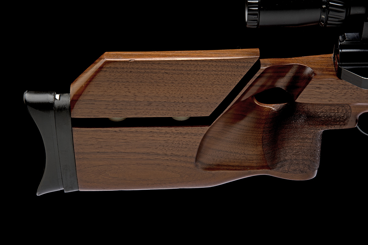 circa 1988, with shrouded blued 19 1/2in. barrel sliding forwards to load, threaded at muzzle for a sound moderator and with chequered protector, locking bolt handle to left hand side, the top of breech marked 'GENESIS, A.R. SPENCER AIR LOGIC ENGLAND PATT APPLIED FOR', blued air-chamber with applied machined telescopic sight rail, machined blackened alloy side-lever pump-handle mounted to the right hand side, period anatomical right-hand stippled walnut thumbhole half-stock with adjustable comb and rubber recoil-pad (probably by 'CS'), the whole retaining nearly all its original finish and in working order, together with a PAO 3-12x44 telescopic sight.