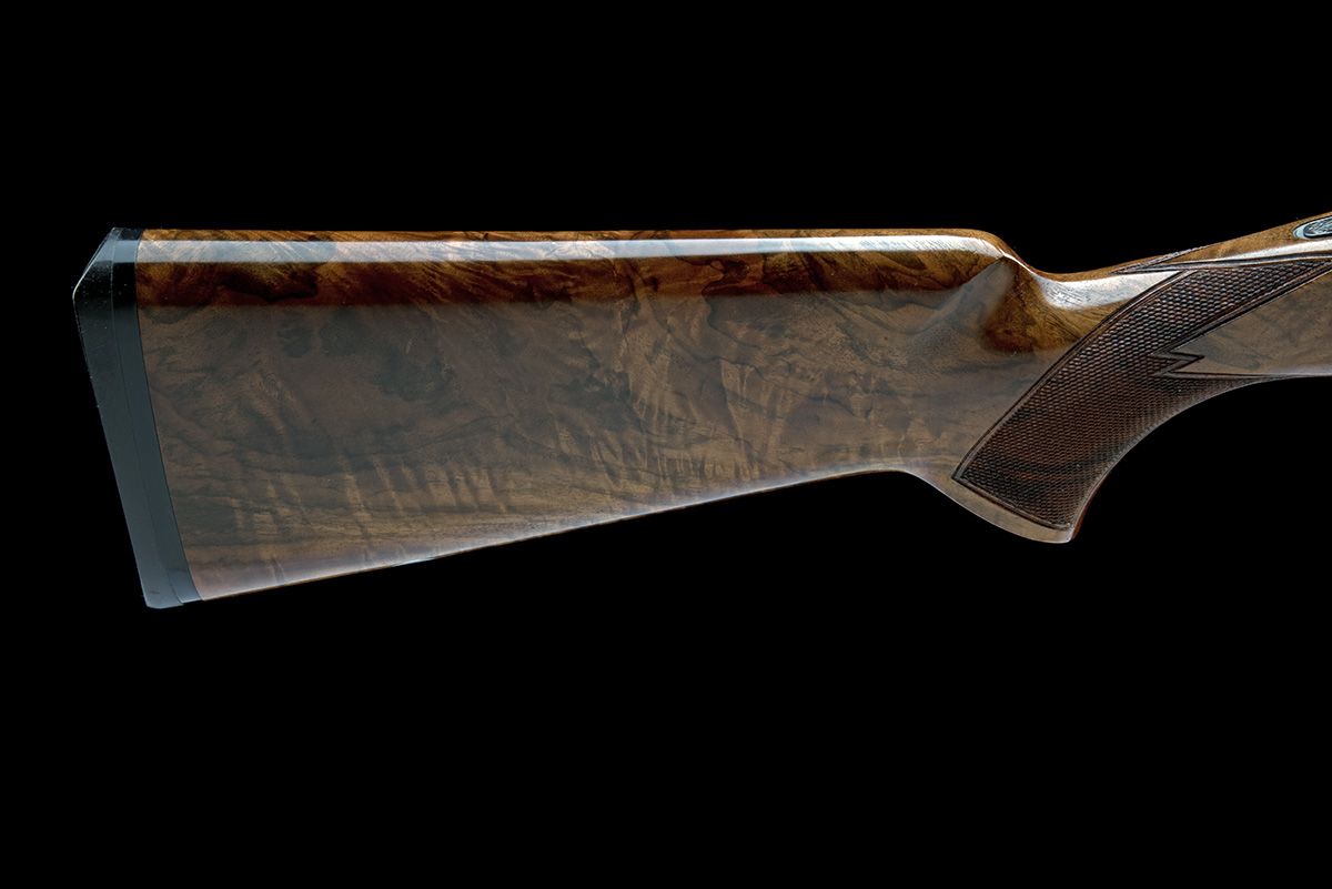 for 1990, 28in. nitro reproved barrels with 13mm ventilated matt top-rib, 2 3/4in. chambers, multichokes (with spares), hold-open toplever, manual safety with integral barrel selector switch, adjustable gold-washed trigger, bold acanthus scroll engraving with game scenes of pheasant, duck, partridge and hound, 15 1/4in. highly-figured replacement pistolgrip stock including 5/8in. recoil pad, weight 7lb. 15oz.