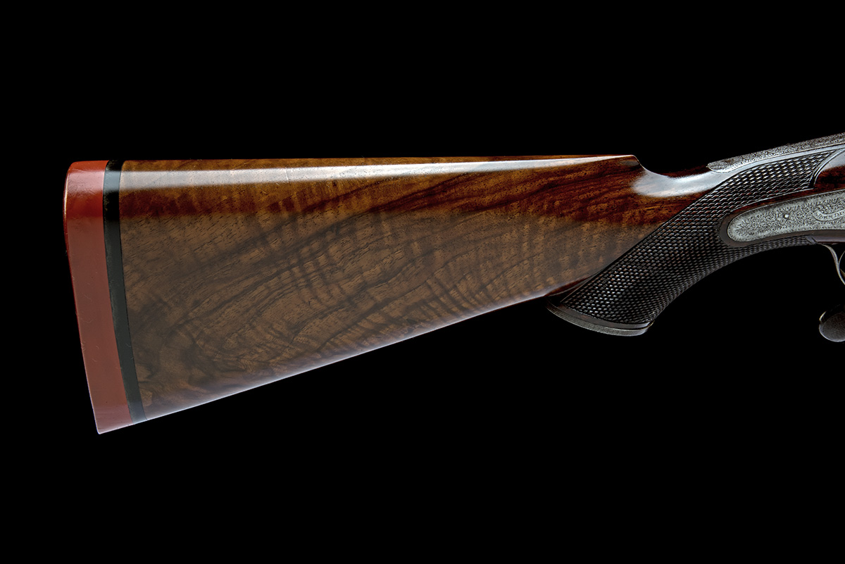 for 1893, 35in. nitro reproved (in 2022) bold damascus barrel with sighting flat engraved 'JOHN DICKSON & SON. 63 PRINCES STREET. EDINBURGH', the sides with panels of scrolling acanthus, 82mm chamber, bored approx. 3/4 choke, Jones patent rotary-underlever, carved percussion fence, rebounding back action lock, the action, lockplate and furniture engraved with fine acanthus scrollwork, some patination, 14 5/8in. figured pistolgrip stock including 1in. recoil pad and with partially engraved steel pistolgrip-cap, fore-end with grip-catch release lever, weight 12lb. 8oz.