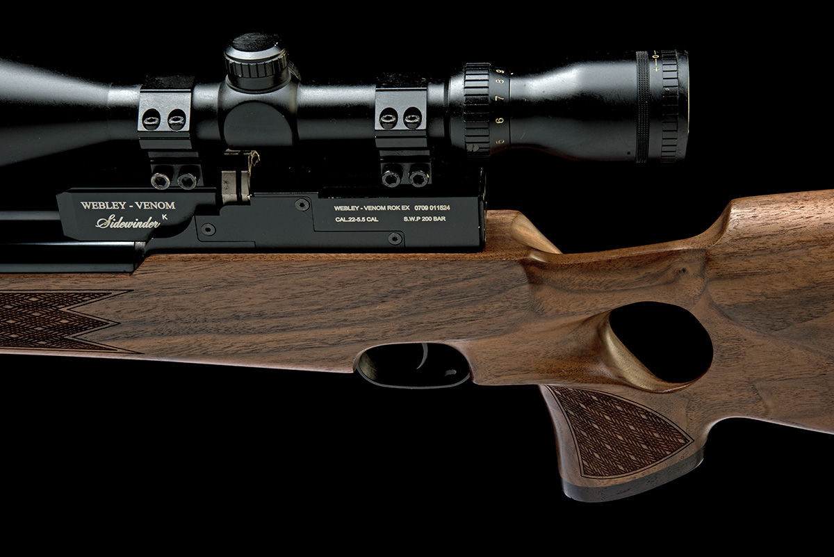 for 2009, with blued 24 1/4in. barrel including detachable sound moderator, blacked alloy receiver with side-lever operation, rotary magazine (spare included) and side safety, both sides of the breech-block marked 'WEBLEY - VENOM' over 'SIDEWINDER K', the serial number and working pressure marked to the left side rear, deluxe walnut thumbhole three-quarter stock with skip-chequered grip and fore-end, the heel of grip with contrasting wood cap marked 'WEBLEY', adjustable heel-pad, pressure gauge inlet into underside of fore-end and under-barrel air reservoir, fitted with an unsigned 3-9x50 telescopic sight, together with a filling probe and spare seals kit (untested)