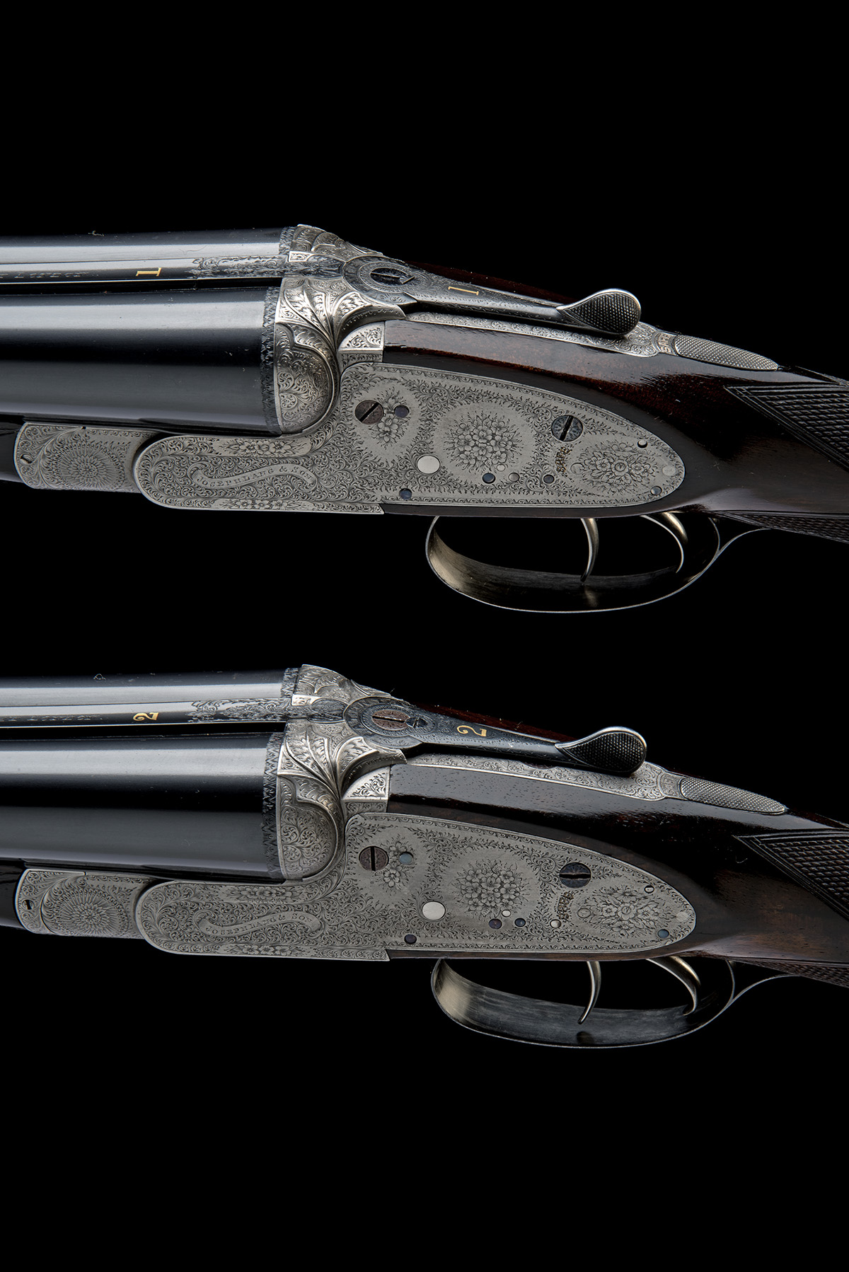 circa 1896, 28in. Whitworth-steel nitro chopperlump barrels, the ribs re- engraved 'JOSEPH LANG & SON LTD. 102. NEW BOND STREET. LONDON' and gold-inlaid '1' and '2' at the breech ends, 2 1/2in. chambers, bored approx. 3/4 and full choke, treble-grip actions with removable striker discs, carved stylised leaf fences, toplevers gold-inlaid '1' and '2', automatic safeties, best fine acanthus scroll engraving with floral bouquets, the makers name in scrolling banners to the sides, the left lockplates with uniform floral engraved panel inserts and 'SAFE' wording over-engraved (originally intended for side safeties), the triggerguards gold-inlaid '1' and '2', brushed and blued finish, 14 5/8in. semi-pistolgrip stocks including 3/8in. wooden buttplates, No.2 fore-end wood cracked, weight 5lb. 6oz., in their brass-cornered oak and leather case