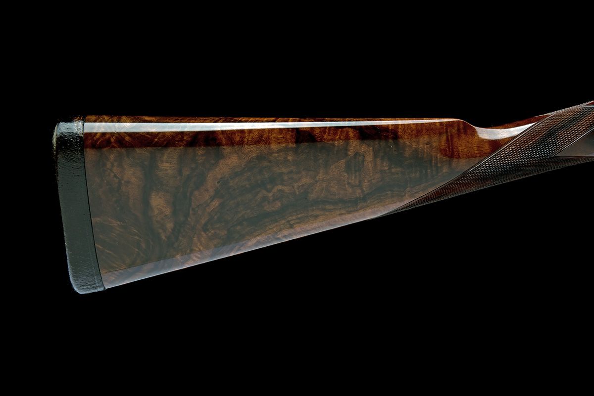 for 1912, 30in. replacement nitro chopperlump barrels with broad raised matt rib, the tubes engraved 'J. PURDEY & SONS. AUDLEY HOUSE. SOUTH AUDLEY STREET. LONDON. ENGLAND.', 2 3/4in. chambers, bored approx. 1/2 and full choke, large treble-grip action with hidden third bite and side-clips, removable striker discs, automatic safety with gold-inlaid 'SAFE' detail, cocking-indicators, fine acanthus scroll engraving with floral bouquets, retaining very slight traces of original colour-hardening and some renewed finish, blued pins, 15in. highly-figured replacement stock and matching fore-end wood, weight 7lb. 11oz., in its brass-cornered oak and leather case with some accessories