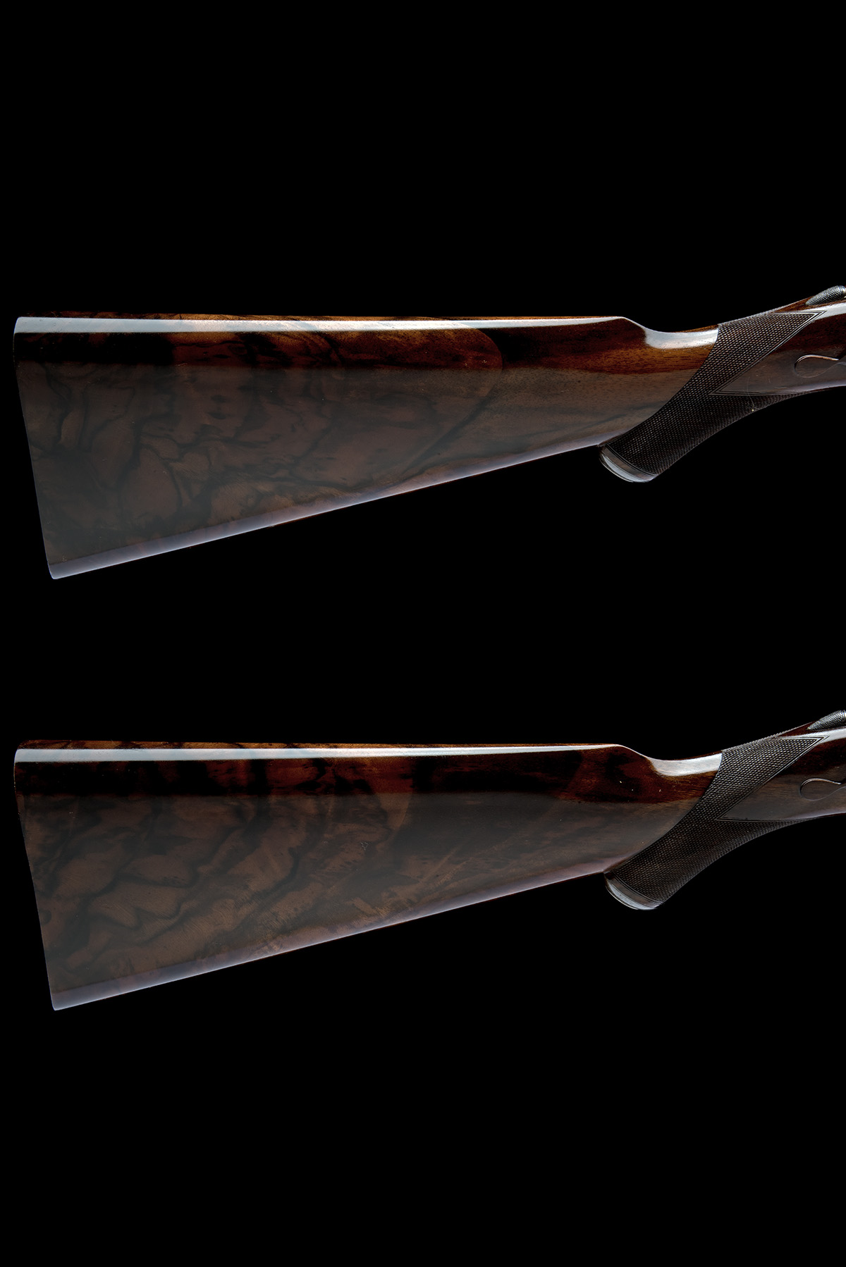 for 1991, 27in. nitro chopperlump barrels with tapered raised ventilated file cut top-ribs, gold-inlaid at the breech ends '1' and '2', side ribs, the over barrels engraved 'J. PURDEY & SONS. LONDON. ENGLAND.', 2 3/4in. chambers, multichokes (with spares), hold-open toplevers gold-inlaid '1' and '2', short side bolsters, automatic safeties with gold-inlaid 'SAFE' details, gold-inlaid cocking-indicators, non-selective single triggers, rolled-edge triggerguards, the action bodies and furniture carved in high relief with bold stylised foliage and leaf motifs on a finely matted background, the undersides with central scrolling banners engraved 'J. PURDEY & SONS', the lockplates finely engraved with scenes of game birds in their natural settings, No.1 gun with pheasant on the left and red grouse on the right, the No.2 gun with French partridge on the left and duck on the right, each scene signed 'P. COGGAN', the triggerguard tangs gold-inlaid with the serial numbers, 14 3/4in. highly-figured replacement pistolgrip stocks (by the makers in 2019) with engraved steel pistolgrip-caps, weight 6lb. 11oz., in their brass-cornered oak and leather case with complement of accessories and a canvas and leather outer cover