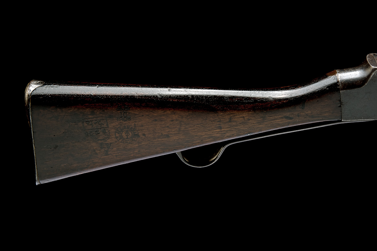 dated 1886, with 32 1/2in. sighted barrel with proof, ownership and inspection marks, left side under rear sight stamped 'NEP. NS' (for Nepal Native Service), right side of receiver with crown over 'V. R. / ENFIELD / 1886 / lock-viewer's mark / I.V. / 1.', full stock, right side of butt with many readable markings including Enfield roundel, Alallabad Arsenal Indian Army roundel, date of '10 / 1908' and Nepalese unit markings, fittings have many WD, Broad Arrow and Enfield inspection marks (front barrel band stamped with an Enfield-Martini 'E-M' noted), Nepalese script on trigger-guard, complete with clearing rod and reproduction sling, some filled chipping where the butt joins the receiver