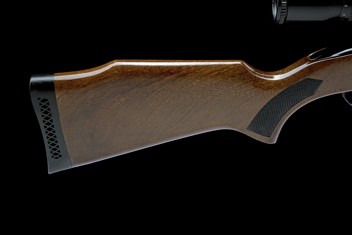 circa 1984, with blued 19 1/2in. barrel, ramp fore-sight, adjustable rear-sight, tap-action breech, blued air-chamber, blacked sloping trigger-unit, chequered walnut half-stock with solid rounded fore-end tip and flush-fitting push-button release underlever, generally collector's external condition and fitted with a Hawke 4x40 telescopic sight