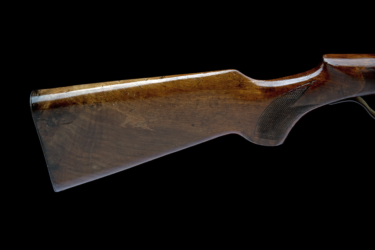 circa 1935, with octagonal to round 18 3/4in. barrel, dove-tailed fore-sight, elevating notch rear-sight, stepped air-chamber with narrowed bolted barrel-jaws and cam-action locking lever mounted to the left side, flared trigger unit, chequered walnut pistol-grip saw-handled butt-stock, iron heel-plate, trigger adjustment screw to front of guard and no provision for fore-end, strong traces of finish