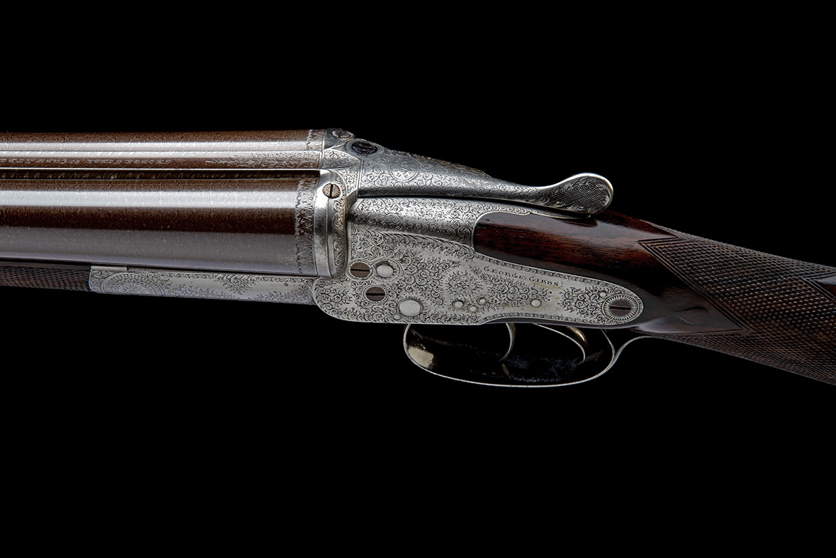 for 1884, 30in. nitro reproved bold damascus barrels with ornately engraved bands at the breech ends, the rib engraved 'GEORGE GIBBS. 29 CORN STREET. BRISTOL.' and '2', 2 1/2in. chambers, bored approx. true cyl. in both, slender fences, striker discs, action incorporating Gibbs & Pitt patent lever-cocking hammerless action, toplever opening and conventional bar-action variant, patent no. 284 of 1873, use number 283, automatic side lever safety with gold-inlaid 'BOLTED' detail, fine acanthus scroll engraving with central floral bouquets, brushed finish, 14 1/4in. figured stock, fore-end with Deeley & Edge patent release and horn finial, weight 6lb. 10oz.
