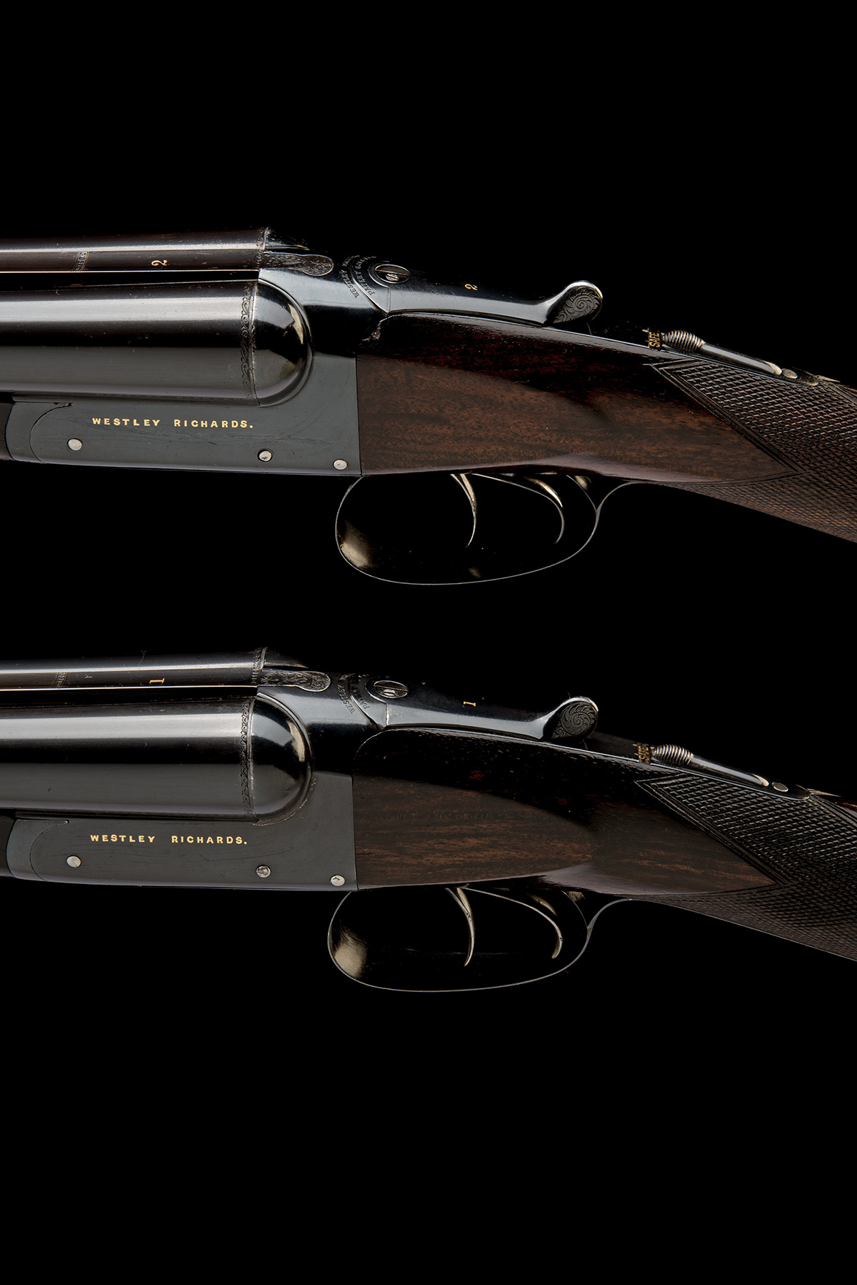 for 1899, 28in. replacement nitro barrels (in 1936 and 1968 respectively, No.1 likely by another, No.2 barrel number 19336), the ribs engraved 'WESTLEY RICHARDS & CO. LONDON.' and gold-inlaid '1' and '2' at the breech ends, 2 1/2in. chambers, bored approx. true cyl. and 3/4 choke (No.1) and imp. cyl. and 3/4 choke (No.2), treble-grip actions, Westley Richards patent toplevers gold-inlaid '1' and '2' and engraved 'WESTLEY RICHARDS PATENT EJECTOR', automatic safeties with gold-inlaid 'SAFE' details, plain actions retaining renewed black finish, with the makers name in gold to the sides, 14 7/8in. figured stocks including 1 1/2in. wooden extensions, fore-ends with Deeley & Edge patent release catches gold-inlaid '1' and '2' and with horn finials, weight 6lb. 10oz. (No.1) and 6lb. 11oz. (No.2), in a brass-cornered leather case