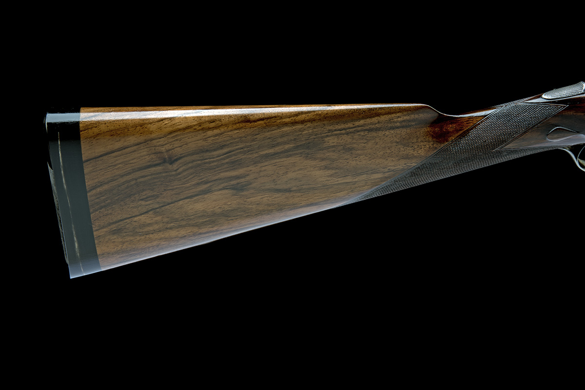 circa 1900, 28in. nitro reproved barrels (in 1973), rib engraved 'H.J. HUSSEY LTD. 81 NEW BOND STREET. LONDON.', 2 3/4in. chambers, bored approx. true cyl. in both, automatic safety with gold-inlaid 'SAFE' detail, gold-inlaid cocking-indicators, articulated front trigger, fine border and acanthus scroll engraving with floral bouquets, retaining some original colour-hardening and finish, 13 1/2in. figured stock (possible replacement) including 3/4in. extension, weight 6lb. 15oz., in a brass-cornered oak-lined leather case, including 2in. stock offcut