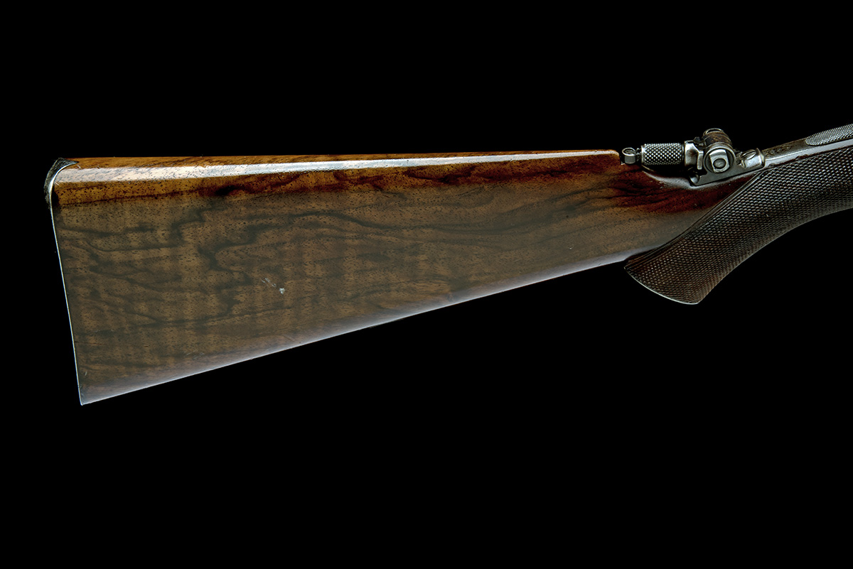 circa 1905, 26in. nitro reproved octagonal barrel (lined from .300 Rook) with partially file cut top flat, hinged bead and aperture fore-sight, open sights with two folding leaf sights, the breech end engraved 'HOLLAND & HOLLAND. 98. NEW BOND ST. LONDON.' and 'WINNERS OF ALL THE "FIELD" RIFLE TRIALS', with later rail mounted scope rings with a vintage military telescopic sight, marked 'TEL. STG. NO.53 MKI OS I075 GA AK & S No. 736. 1944' and with a broad arrow, the hand mounted with a folding adjustable peep sight (the comb well carved for the sight to seat flush when folded), non-selective ejector, automatic safety with gold-inlaid 'SAFE' detail, carved teardrop fences, removable striker disc, fine beaded border and bold acanthus scroll engraving, with central scrolling banners engraved 'HOLLAND & HOLLAND', retaining some colour-hardening and finish, 14 1/2in. well-figured pistolgrip stock with cheekpiece, engraved and colour-hardened steel pistolgrip-cap and blued steel buttplate, Hackett-style snap fore-end with horn finial, weight 7lb. 3oz.