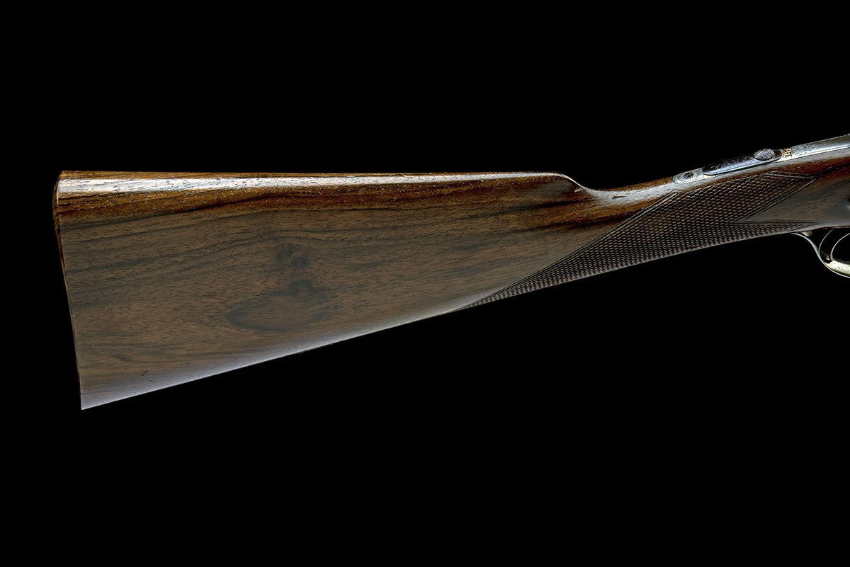 circa 1900, 27 3/4in. blacked damascus nitro barrels, rib engraved 'J. HARKOM & SON. EDINBURGH.', 2 1/2in. chambers, bored approx. imp. cyl. and 1/2 choke, characteristic Harkom treble-grip action, automatic safety with gold-inlaid 'SAFE' detail, border and partial scroll engraving, retaining traces of original colour-hardening and finish, 13 1/4in. stock, weight 5lb. 3oz., in a canvas and leather case