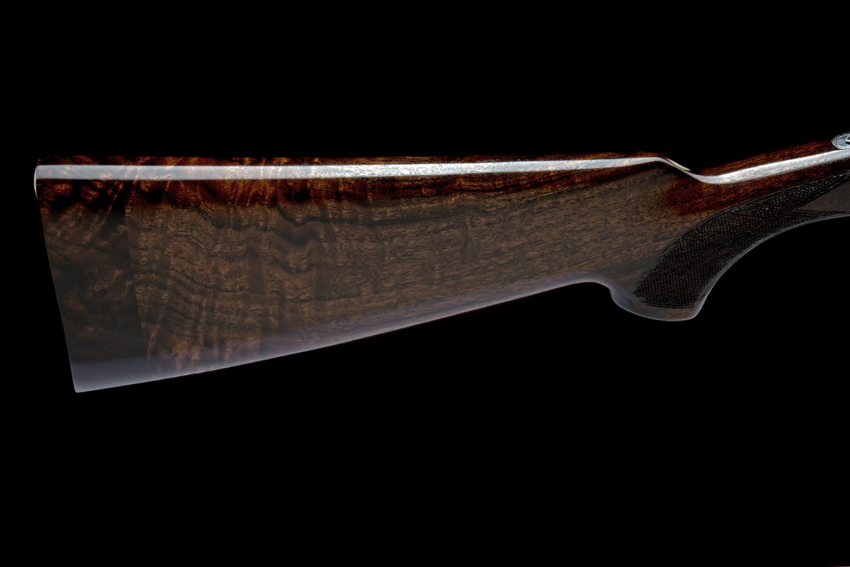 for 1999, 29 1/2in. nitro barrels with 6mm ventilated matt top-rib, 3in. chambers, bored approx. imp. cyl. and 1/4 choke, hold-open toplever, automatic safety with integral barrel selector switch, gold-washed trigger, acanthus scroll engraving, the decorative sideplates with gold-highlighted scenes of hound and fowl, 15 5/8in. pistolgrip stock including 1 1/2in. wooden extension, weight 6lb. 2oz., in its universal case and with a leather gunslip