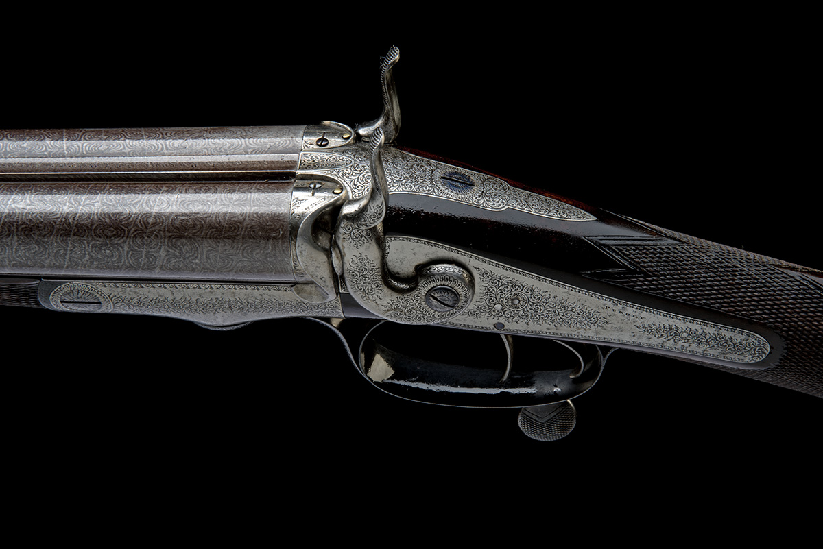 for 1866, 29 1/4in. nitro reproved bold damascus barrels (in 2011, wall thicknesses well below recommended minimum), rib engraving indistinct, 2 3/4in. chambers, bored approx. true cyl. in both, Jones-patent rotary underlever, carved serpentine fences, action incorporating Purdey patent No. 424 of 1865, non-rebounding back-action locks with hammers of hare's ear form with linked strikers, Purdey patent cocking-indicators, patent No. 1464 of 1866, fine border and acanthus scroll engraving, brushed bright, 13 3/4in. figured stock including buttplate, weight 6lb. 3oz.