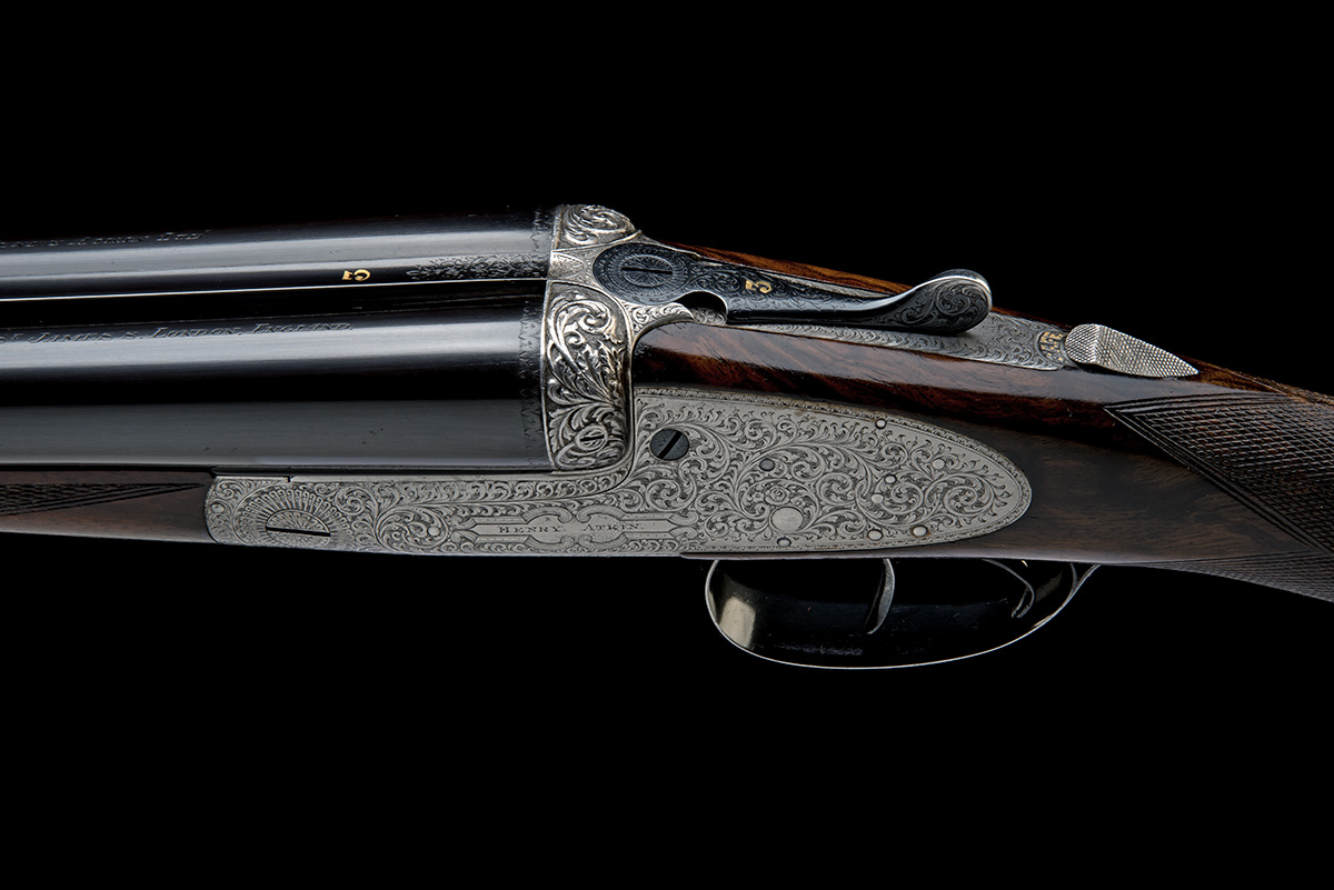 for 1912, 28in. replacement nitro reproved chopperlump barrels (in 1987, reproved after chambers extended in 1989), rib gold-inlaid '3', tubes engraved 'HENRY ATKIN LTD. 7, BURY STREET ST. JAMES'S LONDON.', 2 3/4in. chambers, bored approx. true cyl. and imp. cyl choke, rounded bar action with removable striker discs, the fences deeply carved with scrolled acanthus, toplever gold-inlaid '3', automatic safety with gold-inlaid 'SAFE' detail, spring opening action based on the Beesley / Purdey 1880 patent with 1909 model improved ejector, best bold scrolling acanthus engraving with floral detailing, the makers name in an elaborate cartouche to the lockplates, the underside with 'HENRY ATKIN FROM PURDEY'S' in a further cartouche, bright and blued finish, 14 3/8in. highly-figured replacement stock, cast on for the left shoulder, the fore-end finial gold-inlaid '3', weight 6lb. 10oz., with a nylon gunslip