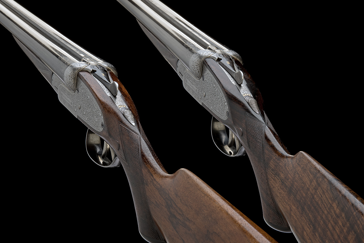 circa 1946, 25 1/8in. nitro chopperlump barrels, matt Churchill-ribs gold-inlaid 'XXV' and '1' and '2' at the breech ends, the tubes engraved 'E. J. CHURCHILL. (GUNMAKERS) LTD. ORANGE STREET GUNWORKS. LEICESTER SQUARE. LONDON.' and with bold acanthus scroll detailing at the breech ends, 2 1/2in. chambers, bored approx. 1/2 and 1/4 choke (No.1) and approx. 1/4 and 1/2 choke (No.2), minor dents No.2, incorporating W. Baker patent assisted-opening mechanism, patent no. 26903 of 27th November 1906, slender fences, toplevers gold-inlaid '1' and '2', automatic safeties with gold-inlaid 'SAFE' details, gold-inlaid cocking-indicators, double rolled-edge triggerguards, bold acanthus scroll engraving with ornate bordering, the lockplates with 'E. J. CHURCHILL', in scrolled cartouches, (No.2 right lockplate with 'E.J. CHURHILL'), the undersides with 'PREMIERE FINEST QUALITY', bright and blued finish overall, 14 7/8in. pistolgrip stocks with pistolgrip-caps and 1 7/16in. wooden extensions with buttplates, weight 6lb. 6oz., in their lightweight leather 'THE V.C. GUNCASE' double motor case