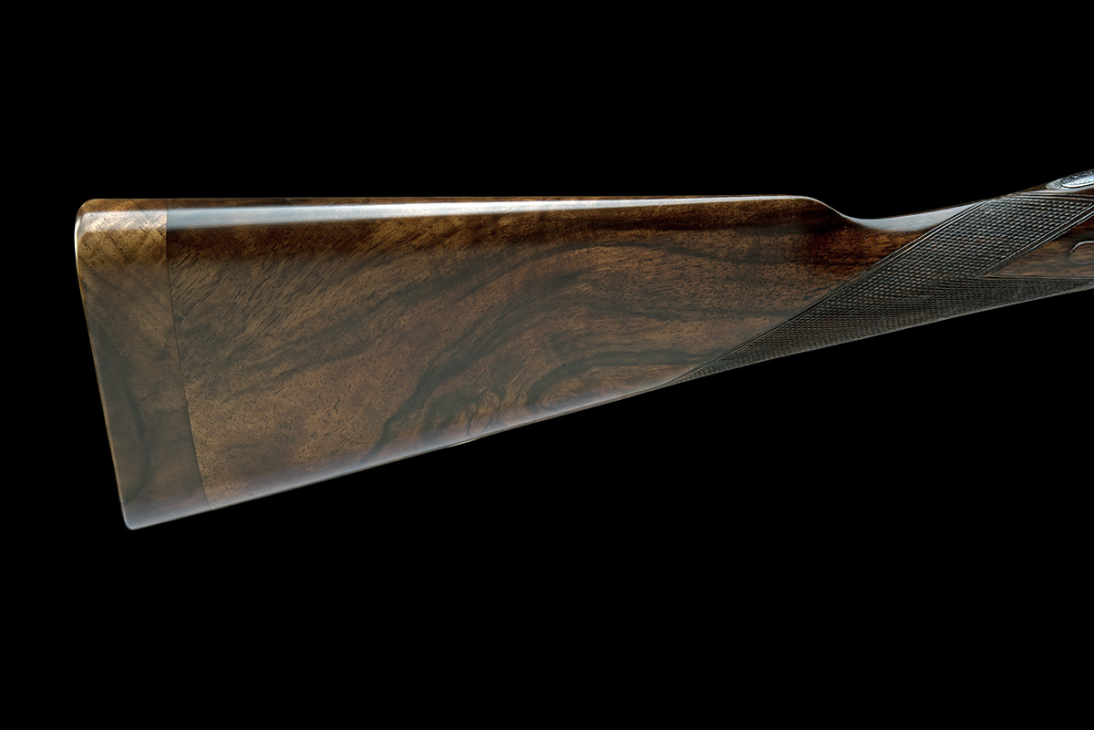 circa 1903, 30in. nitro barrels, the rib gold-inlaid '1' surrounded by scrolling acanthus at the breech end, the tubes engraved 'HOLLAND & HOLLAND. 98, NEW BOND STREET. LONDON.', 2 1/2in. chambers, bored approx. true cyl. and imp. cyl. choke, right wall at 19 and scattered pits, toplever gold-inlaid '1', automatic safety with gold-inlaid 'SAFE' detail, gold-inlaid cocking-indicators, Holland & Holland semi-selective single trigger, best bold Royal scroll engraving, the underside with an ornate cartouche engraved 'ROYAL HAMMERLESS EJECTOR' and an oval cartouche engraved 'PATENT SINGLE TRIGGER', retaining slight traces of colour-hardening, 14 3/8in. figured stock, slightly cast on for the left shoulder, including 1 1/8in. wooden extension, weight 6lb. 7oz., in a brass-cornered oak and leather case with internal protecting flap