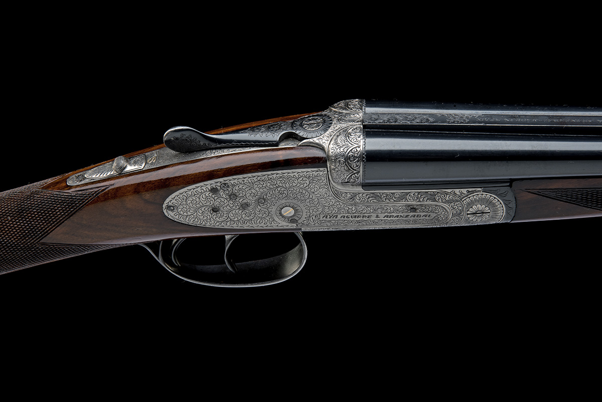 full Spanish code 16-03-631-99 for 1999, 30in. choke reproved nitro chopperlump barrels (in 2017), 3in. chambers, Teague multichokes (with spares), engraved arcaded fences, removable striker discs, automatic safety, hand-detachable lockplates, gold-inlaid cocking-indicators, articulated front trigger, rolled-edge triggerguard, acanthus scroll engraving, 15in. stock, weight 5lb. 13oz., in its leather case