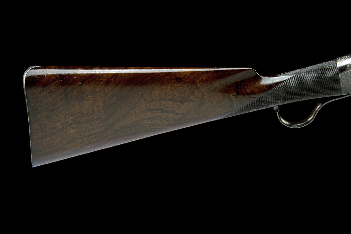 circa 1900, with octagonal 26 5/8in. barrel, machine engraved top-flat with dove-tailed fore-sight, standing 'battue' rear-sight with additional folding leaf, sighting notch to nocksform, machine engraved slab-sided receiver, a folded banner on the right signed 'W.W. GREENER, 68 HAYMARKET, LONDON', side cocking indicator and thumb safety, chequered walnut butt-stock and splinter fore-end and iron furniture including finger-lever with chequered face