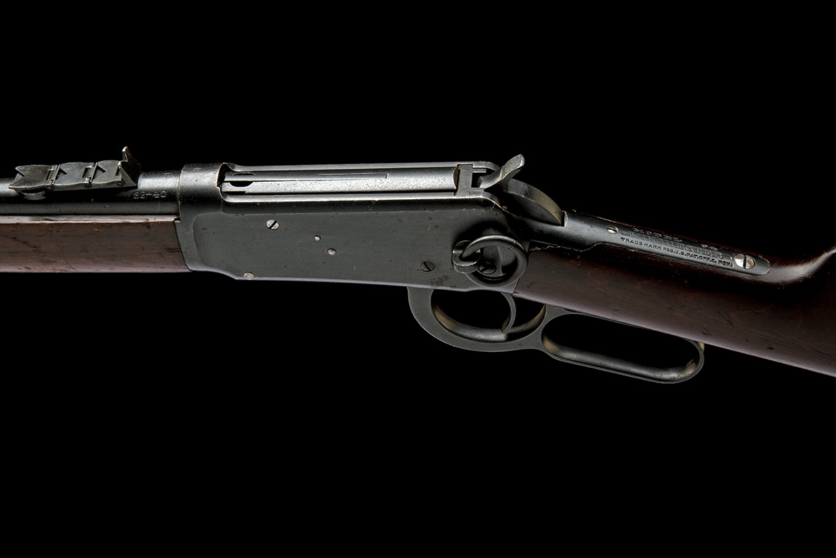 for 1921, with round rapid taper 20in. barrel signed slightly offset to the left 'MANUFACTURED BY THE WINCHESTER REPEATING ARMS CO.' over 'NEW HAVEN CONN U.S.A. PATENTED AUGUST 21 1894', block and blade fore-sight, standing notch rear-sight with three additional folding leaves, slab-sided receiver with side loading gate and top ejection, central hammer, the top-tang marked 'MODEL 94' over 'WINCHESTER' over 'TRADE MARK REG. U.S. PAT. OFF & FGN.', walnut butt-stock, the original heel-plate replaced with a ventilated rubber recoil pad, plain finger-lever, walnut fore-end with single barrel-band and half-length magazine, refinished