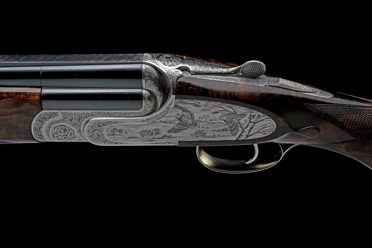 for 2001, 28in. nitro barrels with solid raised tapered matt top-rib, 2 3/4in. chambers, bored approx. 1/4 and 1/3 choke, hold-open toplever, manual safety with gold-inlaid 'S' detail, rolled-edge triggerguard, the action, lockplates and furniture finely carved with acanthus scroll and floral designs, surrounding finely engraved game scenes in Bulino style of pheasant, woodcock and English partridge, the triggerplate signed 'D. BONSI', 14 5/8in. highly-figured semi-pistolgrip stock, weight 7lb. 4oz., in its leather case with paperwork