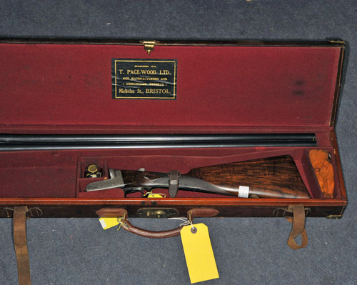 29in. nitro reproved barrels (in 2009), with sunken rib, the tubes engraved 'T. PAGE-WOOD. LTD. 28. ST. NICHOLAS. STREET. BRISTOL, 2 3/4in. chambers, bored approx. 1/2 and full choke, automatic safety, selective single trigger, border and acanthus scroll engraving, 13 3/4in. figured stock, weight 6lb. 8oz., in its brass cornered leather case