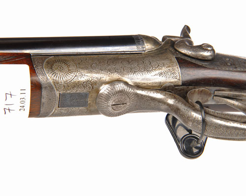 28in. black powder only barrels with matt sight-rib, open sights and engraved 'EDWINSON GREEN & SON. MAKERS. CHELTENHAM & GLOUCESTER', Jones patent rotary-underlever, treble-grip action, carved percussion fences, rebounding back-action locks, border and fine acanthus scroll engraving, surrounding scenes of prowling tiger and lion, retaining slight traces of original colour-hardening, 14 1/2in. well-figured semi-pistolgrip stock including heel and toe plates, pistolgrip inset with a semi-precious stone, replacement fore-end wood, weight 10lb. 3oz., in an oak-lined leather case, the lid impressed 'A.W. CHITTY', together with sighting target