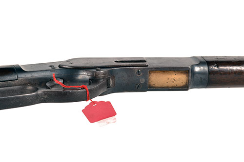 believed to be a Belgian contract copy identical in all respects to the Winchester 1873 Musket, with 30in. barrel, the top marked forwards of rear-sight 'HENRY WINCHESTER MOD 1873 RIFLE', block and blade fore-sight, elevating ladder rear-sight, plain receiver with dust-cover sliding on internal rails with chequered thumb-piece, un-marked top-tang, walnut butt-stock with 'carbine' style heel-plate, centrally mounted sliding trapdoor, three-quarter length walnut fore-end, three iron barrel-bands and under-barrel magazine, the whole retaining a good amount of original finish