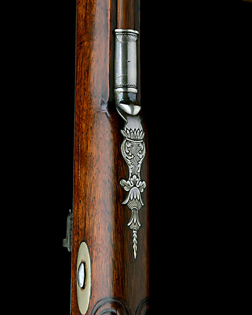 circa 1855, with etched variegated octagonal damascus 33 3/4in. heavy barrel, dove-tailed blade fore-sight, carved dove-tailed rear-sight with interchangeable blades, engraved muzzle around the bore, scroll engraved breech-block (rubbed), long scroll engraved colour-hardened top-tang with square socket for aperture sight (missing), colour-hardened scroll engraved back-action lock with an irregular border, the lock signed in gold 'S IUNG' within a banner, provision for hammer safety (missing), colour-hardened scroll engraved dolphin headed hammer, walnut full-stock with rococco bordered carved chequered panels to the wrist and fore-end, colour-hardened borderline and scroll engraved irregular-shaped iron patch-box inlaid to the right hand side of butt, the centre of lid inlaid with a gold running deer, solid silver heel-plate with scroll engraved long heel-spur, silver winged side-nail cups, silver scroll-engraved trigger-guard tang with raised scrolled semi pistol-grip, broad scroll engraved silver trigger-guard bow, double set-triggers, silver vase finial, triple white-metal oval take-down escutcheons, silver ramrod thimbles, horn schnabel fore-end tip and horn mounted wood ramrod