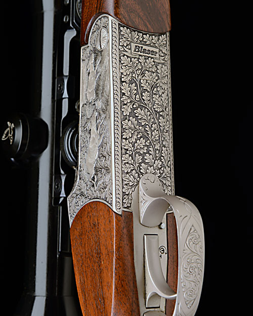 23 3/8in. nitro barrel with open sights and ramp-mounted blade foresight, the breech end mounted with a Swarovski Habicht 3-12x56 Nova telescopic sight in quickly-detachable mounts, lightweight alloy action with sprung breech face, hold-open toplever, manual safety / cocking lever, relief engraved with oak leaf and acorn motifs, surrounding woodland scenes of roe and red deer, the sight ramps and sight mount bases engraved en suite, 14in. well-figured pistolgrip stock with sculpted cheekpiece, pistolgrip-cap with wild boar engraved escutcheon, sling swivel removed and including 1/2in. rubber recoil pad, weight 6lb. 13oz.