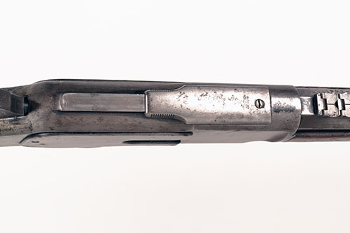 for 1895, with octagonal 24 1/4in. barrel signed 'WINCHESTER'S REPEATING ARMS NEW HAVEN CONN USA. KINGS IMPROVEMENT PATENTED MARCH 29 1866 OCTOBER 16 1860', dove-tailed bladed fore-sight, elevating ladder 'Africa' rear-sight with six additional folding leaves, plain receiver with sliding dust-cover, top-tang drilled for peep-sight, fitted with keeper-screws and marked 'MODEL 1873', walnut straight-hand butt-stock with iron crescent heel-plate fitted with sliding central trap-door, single set-trigger, brass cartridge-lifter with calibre designation, plain walnut fore-end, under-barrel full-length magazine, fitted with a Winchester sling-swivel (front swivel missing), the whole cleaned with minimal traces of finish