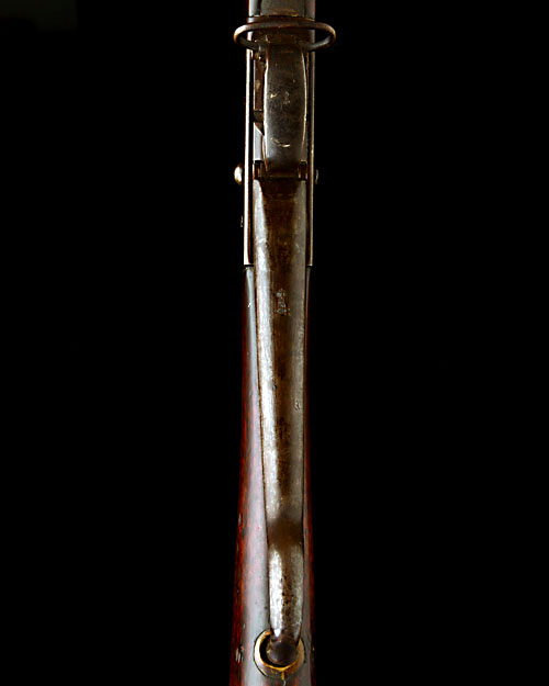dated for 1887, with 33 1/2in. blued barrel, ramp and blade fore-sight, elevating ladder rear-sight, plain receiver with tear-drop cocking indicator to the right hand side together with the markings 'ENFIELD' over '1887' over 'IV' over 'I', the whole surmounted by a crown and 'VR', walnut straight-hand butt-stock stamped with numerous issue numbers, iron heel-plate affixed with bronze screws, walnut fore-end with two iron barrel-bands, the front with integral bayonet lug, iron nose-cap and original iron clearing rod, the whole being an older re-finish