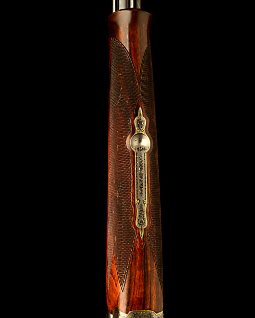 25 1/2in. 'Super Blitz' steel nitro barrels with stepped solid matt top rib, finely engraved with scrolling acanthus and signed 'W. GLANZNIG, folding open sights and ramped bead fore-sight, the breech end finely engraved and gold-highlighted with further scrollwork, gold-inlaid in script 'Dr. Eberhard Rau', and mounted with a Zeiss Diavari-Z 2,5...10x52T* telescopic sight in finely engraved quickly-detachable mounts, single wooden side fillet with finely engraved screw heads, quadruple-grip action with short side-bolsters, removable striker discs, tang mounted shot / ball selector switch, gold-inlaid cocking-indicators, set front trigger, the action, lockplates and furniture exquisitely engraved with fine acanthus scrollwork and floral bouquets with gold highlights, the makers name in scrolling banners, the triggerplate signed 'J. Deflorian', the fore-end iron engraved en suite, bright finish overall, 15in. highly-figured swan-necked stock, inset with a gold-escutcheon bearing a crest, the chequering with beaded borders, sling swivels and including 5/8in. rubber recoil pad, weight 9lb. 10oz., in its brass-cornered maroon leather case with fitted blue velveteen interior and gold-tooled maroon leather makers label