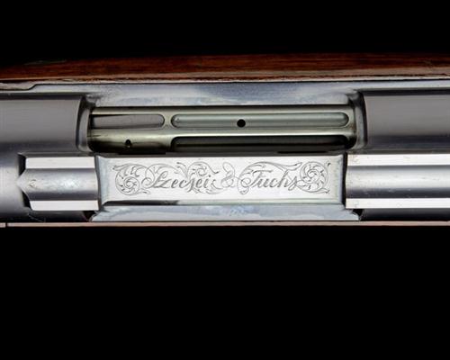 23 1/2in. nitro barrels, stepped raised sight rib gold-inlaid 'CAL. .338 WIN. MAG. 2041 FUCHS FINE GUNS INNSBRUCK AUSTRIA', and engraved 'SZECSEI & FUCHS', open sights and folding leaf sight with gold sight lines and gold-inlaid '50' and '100', ramp-mounted bead fore-sight with fold-over protector / moonsight, the receiver mounted with a Swarovski 1,5-6x42 Habicht telescopic sight in quickly-detachable mounts, Josef Szecsei patent action, no. US5440963, granted 15th August 1995, twin cartridge holding 'cannon breech' bolt, bolt-mounted safety with gold-inlaid 'S' and 'F' details, detachable twin box magazine, gold-washed triggers, firing pins and and magazine release button, recoil block, elongated top strap, elaborately sculpted pistolgrip stock with cheekpiece, engraved and monogrammed steel pistolgrip-cap, sling swivels, 14 3/8in. pull including 1in. rubber recoil pad, weight 12lb. 13oz., with its operating instruction manual and sighting target
