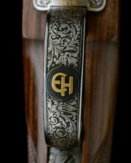24 7/8in. unsighted nitro barrel engraved in gothic script 'J. RIGBY & CO. LONDON', Mauser action (with thumb cutout) mounted with a Zeiss Victory Varipoint 3-12x56 T* telescopic sight in quickly-detachable mounts, the rings engraved with the makers name and calibre designation, floral engraved recoil block, hinged straddle floorplate with push button release, the bolt, sidewall, floorplate and furniture finely carved in high relief with scrolling arabesques on a dark matted background, the bolt partially colour-hardened, the floorplate with central gold-inlaid mouflon, gold-inlaid serial number and calibre designation and signed 'K.C. Hunt', triggerguard gold-inlaid with monogram 'EH', highly-figured pistolgrip stock with cheekpiece, engraved and colour-hardened steel pistolgrip-cap, with trap engraved and gold-inlaid with the portrait of a lion, sling eyes, 15 1/8in. pull including 1in. rubber recoil pad