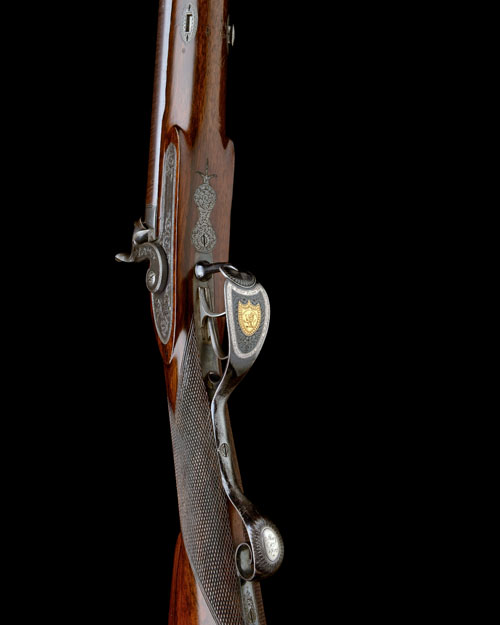 circa 1840, with unsigned browned 27in. barrels (some fading to finish), marked on the underside 'FINE STUB TWIST', London proofs, nickel fore-sight bead, engraved borders and single platinum line to the colour-hardened breech-block, the rib-end engraved with a partridge, raised fences, fully scroll engraved colour-hardened top-tang with engraved screw, colour-hardened border and scroll engraved bar-action locks signed 'JOHN DICKSON & SON', borderline and scroll engraved slab-sided hammers, walnut half-stock chequered at the wrist, blued border and scroll engraved iron heel-plate, blued broad pillar-fronted trigger-guard bow and scrolled tang from an earlier gun, the inlet silver band around the edge of the bow inscribed 'TO WALTER FERGUS ESQ, MAJOR COMMANDANT OF THE KIRKALDY VOLUNTEERS FROM THE NON-COMMISSION'D OFFICERS AND PRIVATES', the centre of the bow with an inlet gold shield engraved with a wreath and a murally crowned rampant lion naissant beneath the motto 'BENIGNO NUMINE' (by favour of the heavens), the scrolled portion of the tang inlet with a silver oval inscribed 'MAY 1st 1802' surrounded by an engraved starburst, fully scroll engraved finial, single barrel key with engraved oval escutcheons and original brass-mounted mahogany ramrod, the whole retaining much original colour and finish throughout; TOGETHER WITH its makers brass-cornered walnut storage case, compartmented and lined in green baize with lidded compartments and containing a near complete compliment of accessories including the original shot and powder flasks, a 'T' type nipple-key, turn-screw, wood cap-pot and nickel oil-bottle, a scissors ball-mould, shot chargers and sundry cleaning tools, a quantity of shot-cards and wads and a take-down cleaning rod, the inside of lid with parchment Dickson trade label, the whole complete with an envelope containing a letter of correspondence from a previous owner dated 1865, click HERE to view the letter, and a period photograph of a Scottish gentleman holding this gun (a further copy of the photograph is attached to the underside of the major compartment lid)