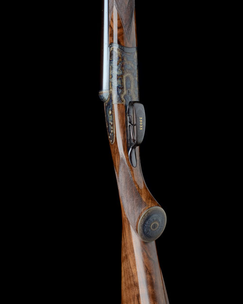 24in. nitro chopperlump barrels with stippled matt sight rib, open sights with gold-inlaid sight line and marked for 50 yards, ramp-mounted bead foresight with protector, the tubes engraved 'HOLLAND & HOLLAND. BRUTON STREET. LONDON.', the rib engraved with the calibre designation, automatic safety with gold-inlaid 'SAFE' detail, rounded bar and back-action lockplates, gold-inlaid cocking-indicators, fine acanthus scroll engraving with floral bouquets, the action bar with elaborate cartouches gold-inlaid 'HOLLAND & HOLLAND', the triggerguard gold-inlaid with the serial number, retaining virtually full original colour-hardening and finish, 14 7/8in. well-figured pistolgrip stock with cheekpiece, engraved and colour-hardened steel pistolgrip-cap, sling eyes, including 5/8in. rubber recoil pad, weight 11lb. 2oz., in its Holland & Holland universal case