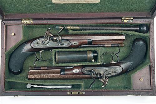 circa 1810, with twist iron 8 1/4in. octagonal barrels, the top-flats signed 'CHAMPION, CHICHESTER', bead fore-sights, engraved band, platinum lined touch-holes and platinum band at breeches, engraved top-tangs with standing notch rear-sights, border and acanthus scroll engraved flat locks with rounded tails signed forwards of the hammers 'CHAMPION, CHICHESTER', sliding safes behind the hammers, rainproof pans, roller frizzens, walnut half-stocks with finely chequered bag-shaped butts, plain triggers, spurred guards and oval escutcheoned barrel-keys, brass mounted wood ramrods, both pistols retaining strong amounts of original colour and finish and in their maker's walnut case lined and compartmented in coarse green baize, parchment makers trade label inside lid, the case tray containing a loading rod, three-way flask and scissors ball mould