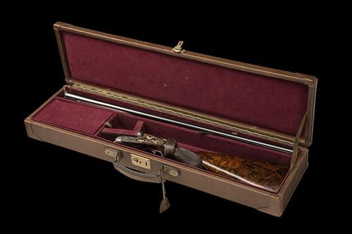 30in. nitro chopperlump barrels with raised tapered file-cut rib, engraved in gothic script 'JOHN RIGBY & CO. 43, SACKVILLE ST. LONDON.', 3in. chambers, bored approx. full choke in both, treble-grip action with fluted leaf fences, the toplever engraved with a dogs head, automatic safety with gold-inlaid 'SAFE' detail, dipped-edge lockplates with gold-inlaid cocking-indicators, finely carved with bold acanthus scrollwork, the underside with a vignette of a duck in flight, the lockplates with later engraving of gold-inlaid fowl and retaining some colour-hardening,14 5/8in. replacement highly-figured semi-pistolgrip stock (cracked at hand) including 1in. wooden extension, weight 7lb. 7oz., in a leather case