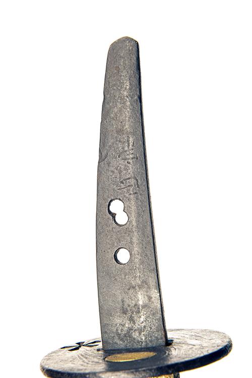 probably 17th century with later carved 'horimono' to the 21in. curved and shortened re-polished blade (slight tarnish spotting and inclusions), finely moulded gilt 'habaki', moulded circular woodgrain effect 'tsuba' pierced with a geometric five petalled flower, both the 'hitsu-ana' filled with yellow metal, short tang signed with a two character signature and pierced with three 'mekugi-ana', cotton bound rayskin hilt with single 'menuki', matching 'fuchi' and 'kashira', complete with its probable original black lacquered segmented scabbard deliberately shortened from the throat to re-accommodate the sword during its working life.