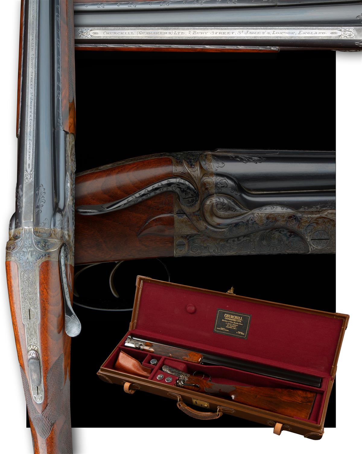 28in. nitro barrels with matt top-rib engraved 'CHURCHILL (GUNMAKERS) LTD. 7. BURY STREET, ST JAMES'S, LONDON, ENGLAND.', the shoulders and breech end engraved with foliate scroll, 3in. chambers, bored approx. imp. cyl. and 1/2 choke, action with ornate scrolling bolsters, sidelever breech locking mechanism, automatic safety with gold-inlaid 'SAFE' detail, double rolled-edge triggerguard, border and acanthus scroll engraving set against a matt background, the underside engraved 'CHURCHILL ZENITH', retaining some original colour-hardening and finish, 14 3/4in. figured stock with carved foliate flutes at the head continuing the form of the scrolling action bolsters, fancy chequering, the stock with gold escutcheon engraved 'MBL', weight 8lb. 2oz., in its makers tan leather case