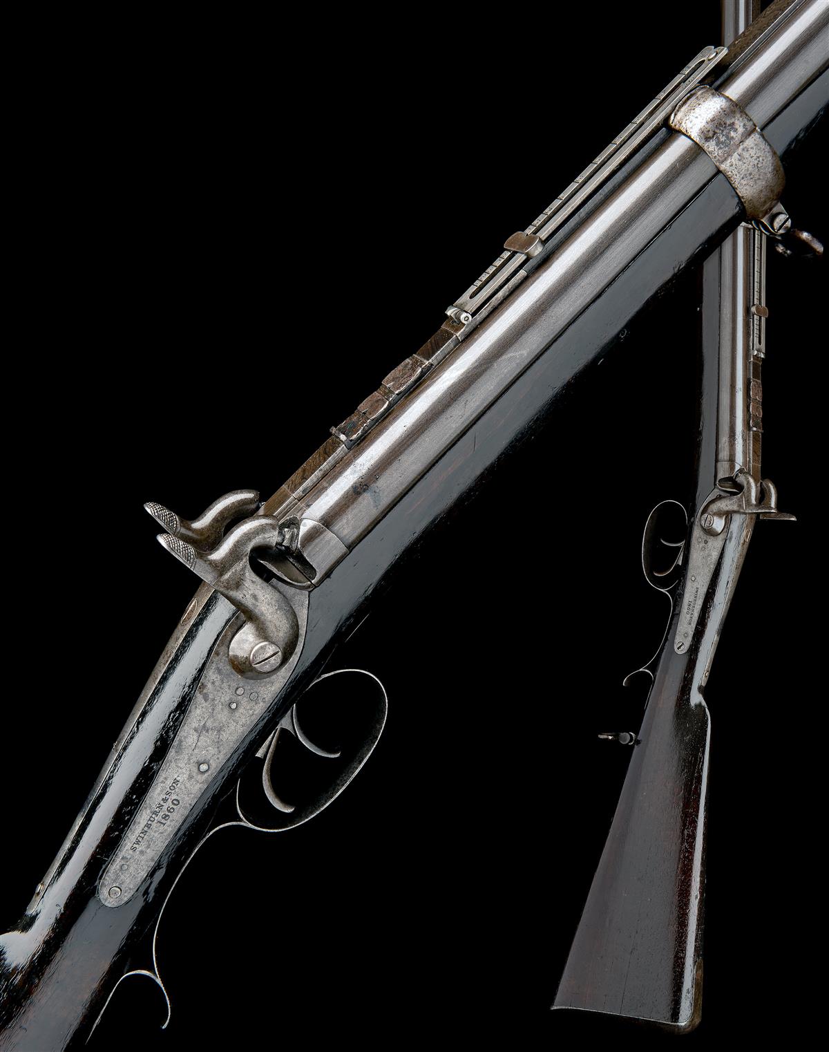 dated '1860', with 24in. blued barrels each rifled with four deep grooves, dove-tailed fore-sight, rear-sight of one standing and three folding leaves calibrated to 300 yards and a folding ladder sight calibrated to 2,000 yards, dated back-action locks each signed 'SWINBURN & SON PATENT 1860', walnut half-stock, iron mounts including hinged patchbox-cover engraved 'JACOB'S RIFLES', iron sling mounts, correct ramrod and bayonet lug mounted at muzzle