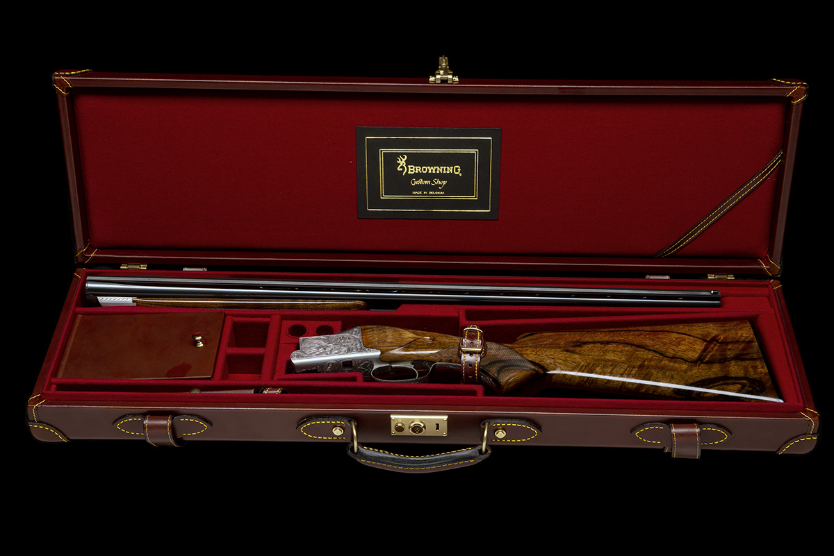 28in. nitro barrels with 12mm ventilated matt top-rib, the top tube engraved 'BROWNING ARMS COMPANY. MORGAN. UTAH & MONTREAL P.Q. MADE IN BELGIUM BY BROWNING. and 'MOD. B25 12 GA. 2 3/4"', 2 3/4in. chambers, bored approx. imp. cyl. in both, hold-open toplever, manual safety with gold-inlaid 'O', 'U' and 'S' detail, bold acanthus scroll bordering surrounding game scenes of mallard and pheasant, the underside with a lone partridge, signed 'J.P. BAILLY', bright finish, 14 1/2in. pistolgrip stock including buttplate, weight 7lb. 10oz, in its lightweight leather case together with its original Browning Custom shop cardboard carton