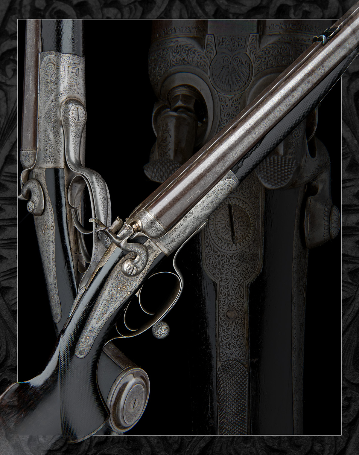 28in. black powder only damascus barrels, broad file cut rib with open sights and folding leaf sight, marked 150 and 250 and with white metal inlaid sight lines, bead fore-sight, the tubes engraved 'W. R. LEESON. ASHFORD. KENT', Henry patent rifling, Jones patent rotary-underlever, treble-grip action with carved percussion fences, manual tang safety with gold-inlaid 'SAFE' detail, rebounding back-action locks, triggerguard tang, barrel flats and fore-end iron numbered 712, barrel under rib and fore-end release catch numbered 1268, very fine acanthus scroll engraving with ornate scrolling decorative bordering, retaining very slight traces of original colour-hardening, 14 3/8in well-figured pistolgrip stock with cheekpiece, sling eyes, engraved steel pistolgrip-cap and buttplate, fore-end with grip-catch release, light damage to wood, weight 8lb. 15oz.