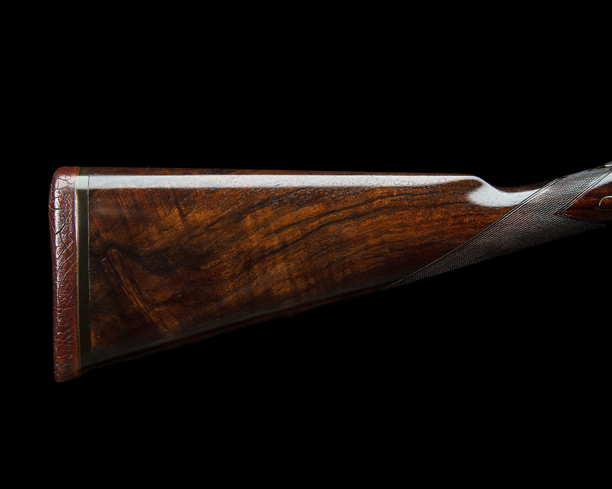 30in. nitro chopperlump barrels, the rib engraved 'J. PURDEY & SONS. AUDLEY HOUSE. SOUTH AUDLEY STREET. LONDON. MADE OF SIR JOSEPH WHITWORTH'S FLUID PRESSED STEEL', the breech end with a No.2 engraved over to form a crowned pineapple finial design, 2 1/2in. chambers, bored approx. true cyl. and imp. cyl. choke, bore dimensions marginal, fences carved in high relief with a grape and vine leaf design, toplever with No.2 engraved over to form a floral design, automatic safety with gold-inlaid 'SAFE' detail, removable striker discs, cocking-indicators, best fine acanthus scroll engraving with floral bouquets, retaining traces of original colour-hardening and much renewed finish, 14 3/4in. figured (likely historic replacement) stock including 3/4in. rubber recoil pad, weight 6lb. 13oz., in a lightweight leather case