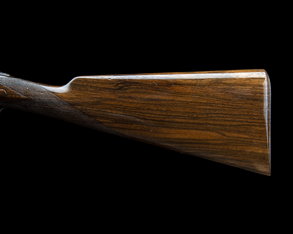 28 1/2in. nitro barrels, file cut rib with a banner engraved 'THE WINNER ** G. BEASSE 25 Avenue de l'Opera PARIS', 2 1/2in. chambers, bored approx. 1/4 and full choke, some internal pitting, manual safety with gold-inlaid 'SAFE' detail, hand-detachable lockplates, gold-inlaid cocking-indicators, rolled-edge triggerguard, bold acanthus scroll engraving akin to the Holland & Holland style, the underside with an elaborate cartouche engraved 'THE WINNER', retaining traces of original colour-hardening and finish, 14 1/4in. stock, weight 6lb. 12oz., in a lightweight leather case