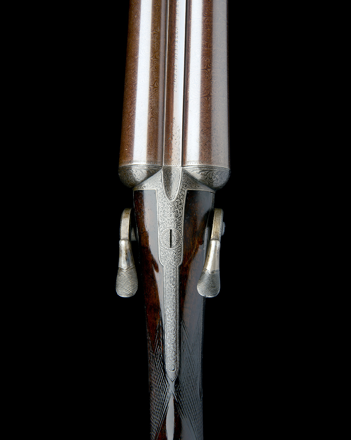 29 1/2in. bold damascus nitro barrels, the rib engraved 'THOMAS BISSELL'S PATENT. 75 TOOLEY STREET. LONDON.', 2 1/2in. chambers, bored approx. true cyl. in both, action incorporating T. Bissell barrel locking and extracting patent no. 1461 of 27th May 1865, non-rebounding back-action locks with internal strikers and external cocking hammers of hare's-ear form, serial numbered removable striker discs, bold acanthus scroll engraving, 14 1/4in. well-figured stock including 1/2in. horn buttplate, weight 6lb. 9oz.