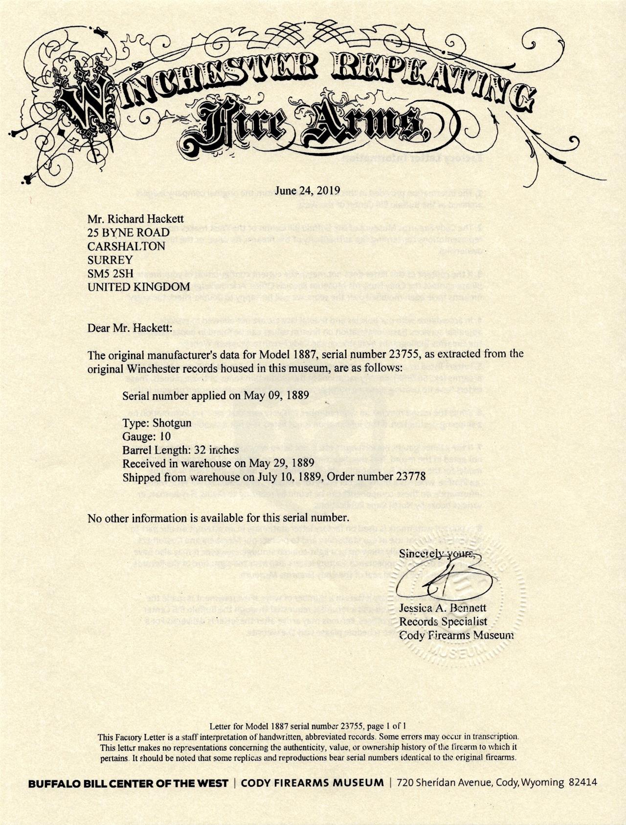 for 1889, with 32in. barrel marked with the gauge at breech, slab-sided receiver engraved with the 'W.R.A.' monogram, tilting breech-block and central hammer operated by a finger lever, plain top-tang, walnut semi pistol grip butt-stock with chequered iron heel-plate, exposed under-barrel magazine and smooth wood side fillets in lieu of fore-end, a fair amount of original finish remaining, weight approximately 8lbs., overall length 49 3/4in., with a factory letter