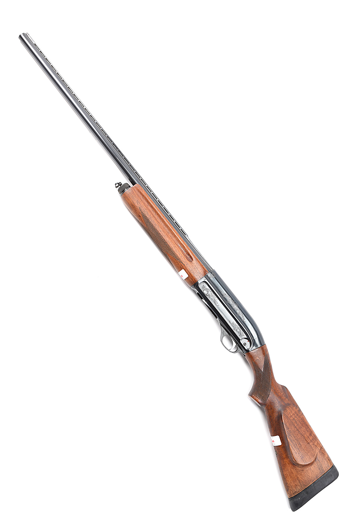 TULA 12-BORE 'MU-21-12' SEMI-AUTO SHOTGUN, serial no. N4703, circa 1974, restricted magazine, 29 1/2in. nitro barrel with 7mm raised ventilated matt rib, 2 3/4in. chamber, bored approx. full choke, sidelever safety, border and acanthus leaf engraving, blacked finish, 14 1/2in. pistolgrip stock including rubber recoil pad, with cheekpiece, sling swivels