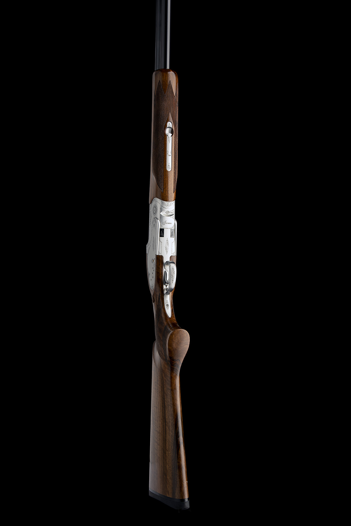 dated 2012, 30in. nitro barrels with ventilated mid-rib (some loss of bluing) and 8mm ventilated matt top-rib, 3in. chambers, multichokes (no spares), hold-open toplever, manual safety, cocking-indicators, pins blued, border engraving, matt silver finish, 15in. pistolgrip stock including 1/2in. rubber recoil pad, weight 8lb. 7oz.